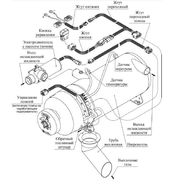 Блоки управления; Жгут питания; Подогреватель; Пульт управления; Электрическая помпа; Топливный насос, Топливный провод; Техническая документация; Гарантийный талон; Комплект для установки устройства;